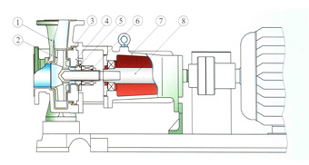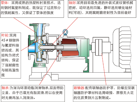IHF氟塑料離心泵是按國際標準并結合非金屬泵的工藝設計制造。泵體采用金屬外殼內襯聚全氟乙丙烯(F46),泵蓋、葉輪和軸套均用金屬嵌件外包氟塑料整體燒結壓制而成,軸封采用外裝式先進的波紋管機械密封,靜環選用99.9%氧化鋁陶瓷(或氮化硅),動環采用四氟填充材料,其耐腐耐磨密封性極好。泵的進出口均采用鑄鋼體加固,以增強了泵的耐壓性。實際使用顯示,該泵具有耐腐、耐磨、耐高溫、不老化、機械強度高、運轉平穩、結構先進合理、密封性能嚴格可靠、拆卸檢修方便、使用壽命長等優點。