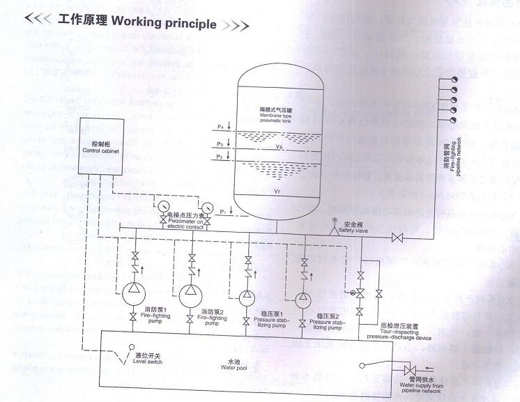 該設備采用囊式(隔膜)氣壓給水,當穩壓水泵處于低壓工作壓力P3時,由壓力繼電器傳感信號通過電控箱自動啟動水泵向罐內補水,且同時增壓,當壓力達到高工作壓力P4時,穩壓水泵自動停止,此時的系統壓力在低工作壓力P3和高工作壓力P4之間變化。