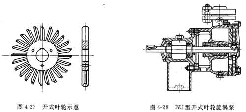 ②開式葉輪 圖4-27所示為常用的開式葉輪,液體自葉輪側(cè)面(小直徑處)進(jìn)入葉片間,葉片中心線處沒有隔板。具有這種葉輪形式的旋渦泵汽蝕性能較高,可以做成自吸泵和氣液混輸泵,但體積較大,效率低(η=0.2~0.4)。典型結(jié)構(gòu)如圖4-28所示。