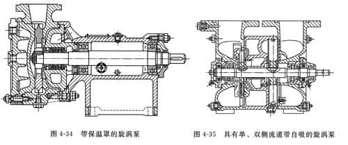 ①保溫旋渦泵 某些化學(xué)工業(yè)用泵,對(duì)輸送液體要求保持一定的溫度。否則液體可能揮發(fā)、結(jié)晶、凝結(jié)或產(chǎn)生化學(xué)變化。因此,通常是在泵過流部件的外圍加保溫罩,在其間通過具有一定溫度的液體,以達(dá)到保溫的目的。圖4—3 4所示為帶保溫罩旋渦泵的結(jié)構(gòu)。