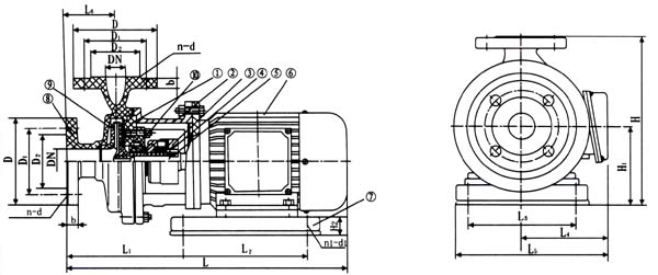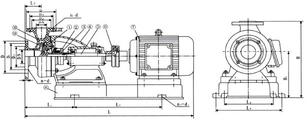 6、如果更換滾珠軸承或泵軸時,必須拆下機架,松開前端軸承蓋4只螺釘。拆下泵軸后端螺母和聯軸器,將泵軸向前端方向打出即可,再后拆下后端軸封蓋。