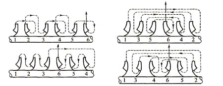 這種方案流道復(fù)雜,造價(jià)較高。當(dāng)級(jí)數(shù)較多時(shí),由于各級(jí)泄漏情況不同和各級(jí)葉輪輪轂直徑不相同,軸向力也不能完全平衡,往往還需采用輔助平衡裝置。