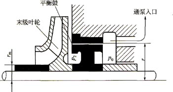 平衡盤(pán)左邊和末級(jí)葉輪出口相通,右邊則通過(guò)一接管和泵的吸入口相連。因此,平衡盤(pán)右邊的壓力接近于泵入口液體的壓力加,平衡盤(pán)左邊的壓力P’小于末級(jí)葉輪出口壓力P0。即高壓液體能通過(guò)平衡盤(pán)與平衡環(huán)之間的問(wèn)隙%回流至泵的吸入口,在平衡盤(pán)兩側(cè)產(chǎn)生一個(gè)平衡力。