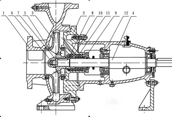 1 泵體 2 泵蓋 3 葉輪 4 軸 5 密封環 6 葉輪螺母 7 止動墊圈 8 軸套 9 填料壓蓋 10 填料環 11 填料 12 懸架軸承部件