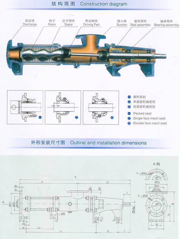 G型單螺桿泵是按迥轉嚙合容積式原理工作的新型泵種,主要工作部件是偏心螺桿(轉子)和固定的襯套(定子)。由于該二部件的特殊幾何形狀,分別形成單獨的密封容腔,介質由軸向均勻推行流動,內部流速低,容積保持不變,壓力穩定,因而不會產生渦流和攪動。每級泵的輸出壓力為0.6Mpa,揚程60m(清水),自吸高度一般在6m,適用于輸送介質溫度80℃以下(特殊要求可達150℃)。因定子選用多種彈性材料制成,所以這種泵對高粘度流體的輸送和含有硬質懸浮顆粒介質或含有纖維介質的輸送,有一般泵種所不能勝任的特點。其流量與轉速成正比。傳動可采用聯軸器直接傳動,或采用調速電機,三角帶,變速箱等裝置變速。這種泵零件少,結構緊湊,體積小,維修簡便,轉子和定子是本泵的易損件,結構簡單,便于裝拆。