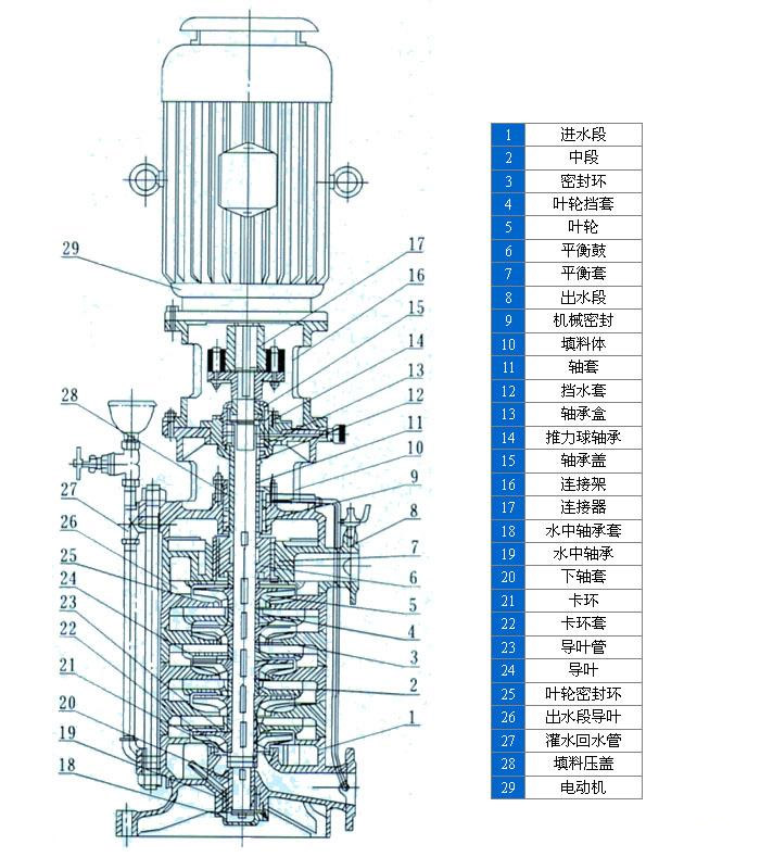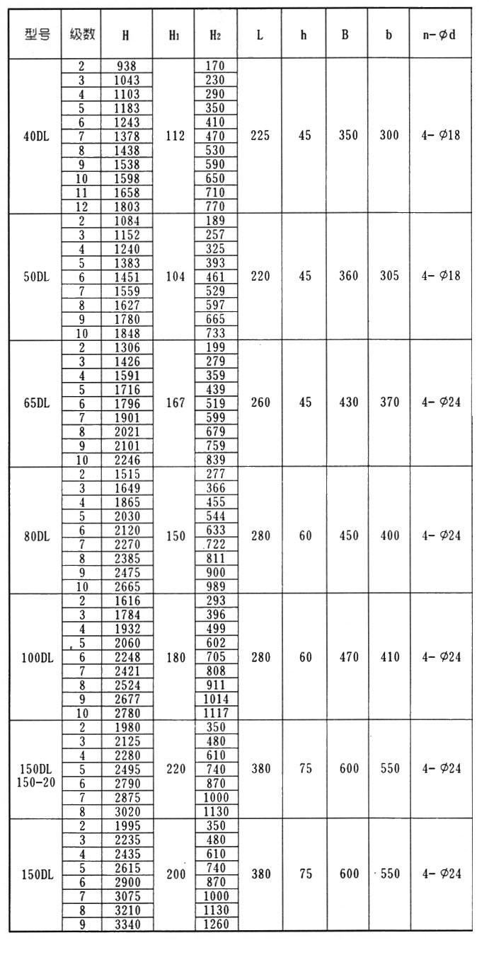DL型多級離心泵是采用國家推薦使用的高效節能產品IS型泵的水力模型,為立式多級多節段式結構。螺桿把進水段、中段、出水段夾緊聯成一體。水泵每一級裝一個葉輪、一個導水葉。軸向力采用水力平衡法解決,殘余軸向力由球軸軸承承受,用油脂潤滑。軸封采用軟填料或機械密封。產品執行JB/T2727-93《立式多級離心泵型式與基本參數》標準,主要供吸送稀釋的、清潔的、不腐蝕的、不爆炸的清水及物理化學性質類似水的不含固體顆粒或纖維的液體。