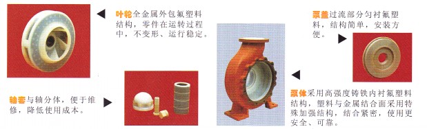 IHF型離心泵按國際標準設計,泵體采用金屬外殼內襯氟塑料,葉輪及泵蓋均用金屬嵌件外包氟塑料合金壓制成型,軸封采用外裝式先進的波紋管機械密封,靜環選用99.9%氧化鋁陶瓷,動環采用四氟填充材料,其特點是耐腐耐磨密封性好 。
