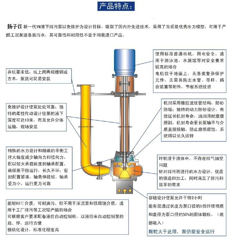 6、泵為立式結構,工作時泵體浸在液體中因而很容易起動,不存在排氣抽空問題,同時具有無泄漏等特點,液下深度可達15米。