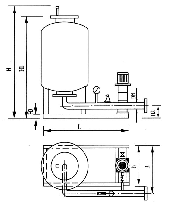 囊式膨脹定壓罐主要罐體、供水膠囊、進(jìn)(出)水口、充氣裝置、壓力表、排氣閥等組成。供水膠囊采用純天然無毒橡膠制成,具有良好的韌性和伸縮性能,它與進(jìn)水口相通,并且形成一個(gè)密閉的腔室將水與外部鋼罐內(nèi)壁完全隔絕,膠囊和鋼罐內(nèi)壁之間充有氮?dú)猓哂泻軓?qiáng)的化學(xué)惰性及比熱容大等優(yōu)點(diǎn)。囊式定壓罐主要利用氣體的可壓縮性,對系統(tǒng)由于溫度變化引起的水體積增大或減少進(jìn)行吸納或補(bǔ)充作用。當(dāng)系統(tǒng)溫度增高時(shí),水體積增大,這時(shí)系統(tǒng)壓力大于罐內(nèi)氣體壓力,部分水會(huì)被壓入罐內(nèi)的膠囊里,直到罐內(nèi)氣體的壓力與系統(tǒng)壓力達(dá)到平衡。當(dāng)系統(tǒng)溫度降低時(shí),水體積變小,這時(shí)罐內(nèi)氣體壓力大于系統(tǒng)壓力,部分水會(huì)被壓回系統(tǒng),起到對系統(tǒng)補(bǔ)充水量的作用。囊式定壓罐通常與外部的控制箱,補(bǔ)水泵及電接點(diǎn)壓力表等,連接形成機(jī)組,根據(jù)系統(tǒng)的低需要壓力及高運(yùn)行工作壓力設(shè)定工作狀態(tài),性能特點(diǎn)和應(yīng)用范圍