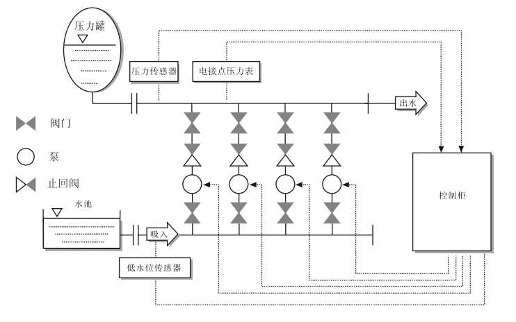 當管網壓力大于啟動壓力設定值時由與出水管路連接的壓力罐供水,如果管網壓力等于啟動壓力設定值時啟動水泵,水泵運行中管網壓力達到停止壓力時停止水泵運行,水泵啟動后管網壓力超過啟動壓力,未達到停止壓力時水泵繼續運行;水泵全速運行后管網壓力未到達啟動壓力時水泵追加啟動。