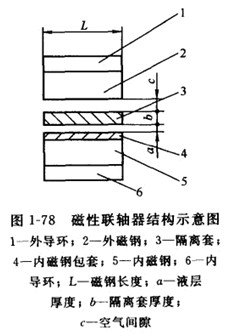 磁性聯(lián)軸器由內(nèi)磁鋼(含導環(huán)和包套)、外進鋼(含導環(huán))及隔離套組成(見圖1-78),是磁力泵的核心部件。磁性聯(lián)軸器的結(jié)構(gòu)、磁路設計,及其各零部件的材料關系到進力泵的可靠性,磁傳動效率及壽命。
