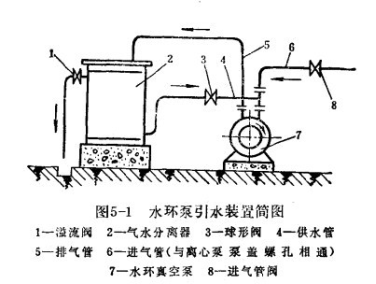 水環式真空泵引水裝置如圖5-1所示。水環式真空泵的進氣管6與水泵泵蓋的頂部相連,在沒有自來水的地方,必須配置氣水分離器,作為真空泵冷卻水和補充水的水源。
