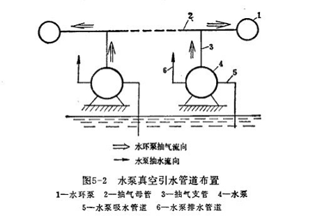 如果泵站中有兩臺以上的水泵,則可將水環式真空泵進氣管與抽氣母管相通,每臺泵的泵殼頂部通過抽氣支管與抽氣母管相連。在每個支管上都安裝一個閥門,以便可以單獨對每一臺泵抽氣。有時,為了備用起見,可以設置兩臺水環式真空泵,每一臺的進氣管上都安上閥門。當一臺發生故障時,可以關閉該泵上的進氣閥門,利用另外一臺抽氣,不致耽誤水泵的起動。正常情況下兩臺水環式真空泵可對水泵同時抽氣,以加快引水速度。整個管路布置如圖5-2所示。