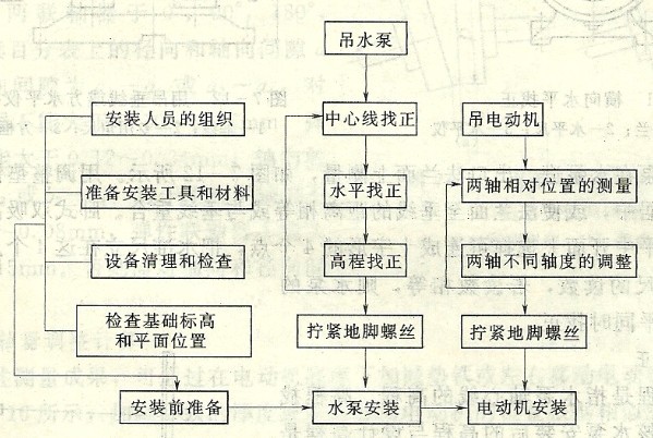 臥式離心泵安裝程序如圖所示。水泵就位前應復查基礎水平和高程。水泵的中心線找正、水平找正,是安裝過程中的關鍵。
