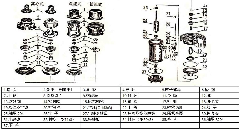 QY泵由水泵,密封和電動機三部分組成,水泵位于電泵上部,為離心式或軸流式結構。電動機位于電泵下部為充油式三相異步電動機,QY泵與電動機之間采用內裝式整體機械密封盒密封,各固定止口密封處采用“O”形耐油橡膠密封圈作靜密封。