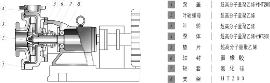 2) 泵體為鋼襯超高分子量聚乙烯結構,襯里厚度為8~20mm,該泵應用了襯塑專利技術,和其它同類泵相比較,具有襯里層抗熱變形性能好,耐開裂,防脫落,使用溫度高等優勢。